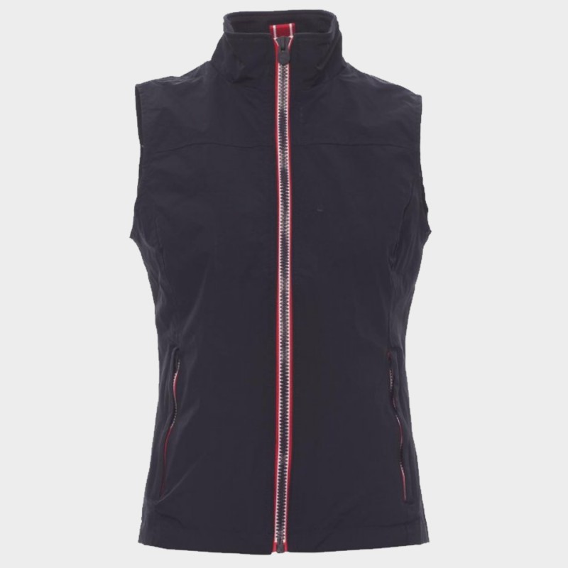 Γυναικείο γιλέκο, φερμουάρ σε αντίθεση 8 mm, δύο εξωτερικές τσέπες με κρυφό φερμουάρ. Χωρίς επένδυση, διχτυωτή επένδυση, μία εσωτερική τσέπη με φερμουάρ με άνοιγμα για ακουστικά smartphone, φερμουάρ στο στήθος και στο κάτω μέρος για ευκολότερη εκτύπωση και κέντημα.