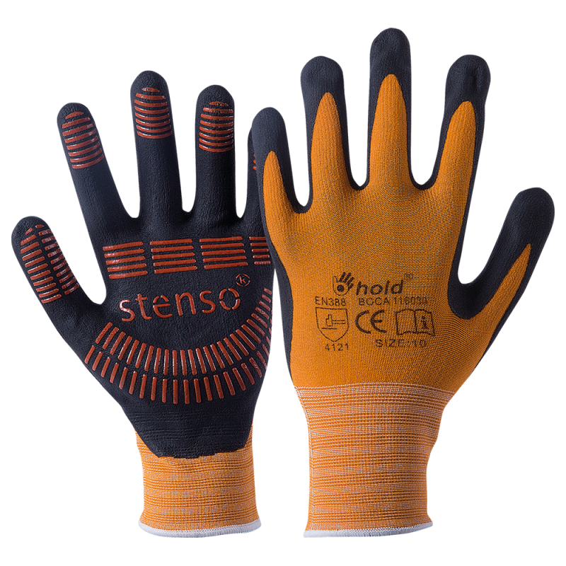 Γάντια από jersey πολυαμίδιο με lycra, λιωμένο σε αφρό νιτριλίου, ελαστική μανσέτα, αναπνεύσιμο πίσω μέρος, ανάγλυφο νιτριλίου στην παλάμη και τα δάχτυλα. Υψηλή αντοχή στα έλαια και την τριβή.
