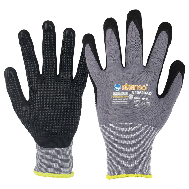 Γάντια από πολυαμίδιο/lycra 15G, εμβαπτισμένα σε μικροπορώδες νιτρίλιο, με σταγόνες νιτριλίου