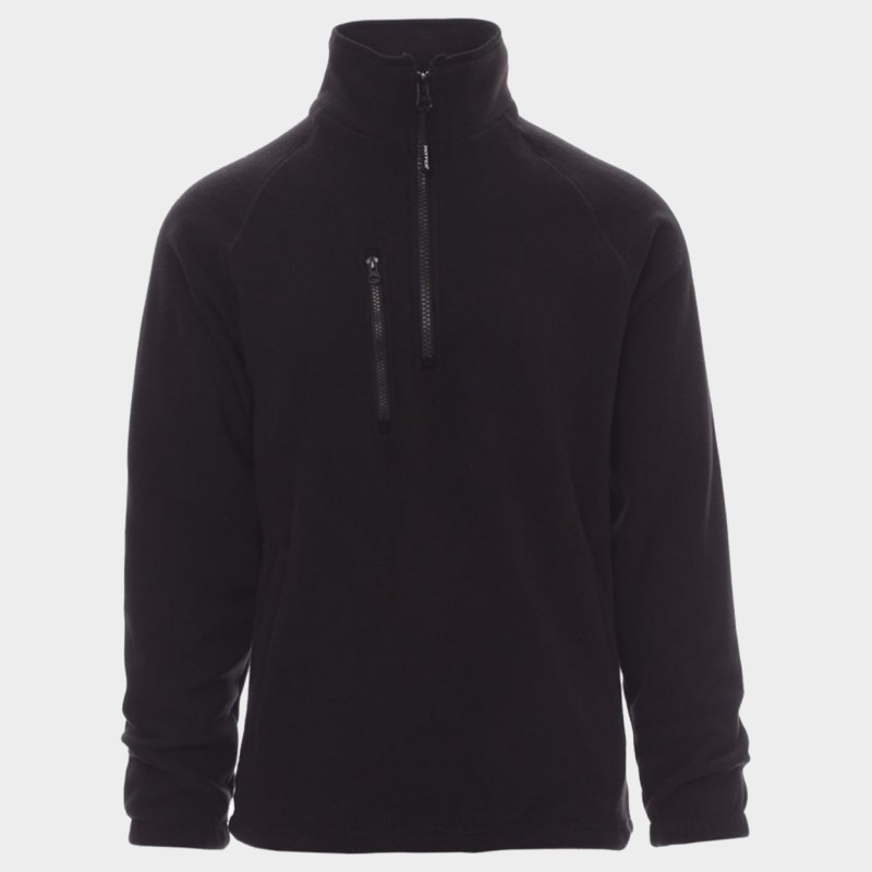 Ανδρική φλις μπλούζα, με μαύρο πλαστικό μισό φερμουάρ 8 mm, μανίκια ρεγκλάν, ρυθμιζόμενο κορδόνι στη μέση, ελαστικές μανσέτες, δύο τσέπες με κρυφό φερμουάρ, μία μπροστινή τσέπη με φερμουάρ, λαιμόκοψη με ενισχυτική ταινία σε αντίθεση, ενισχυμένες ραφές.
