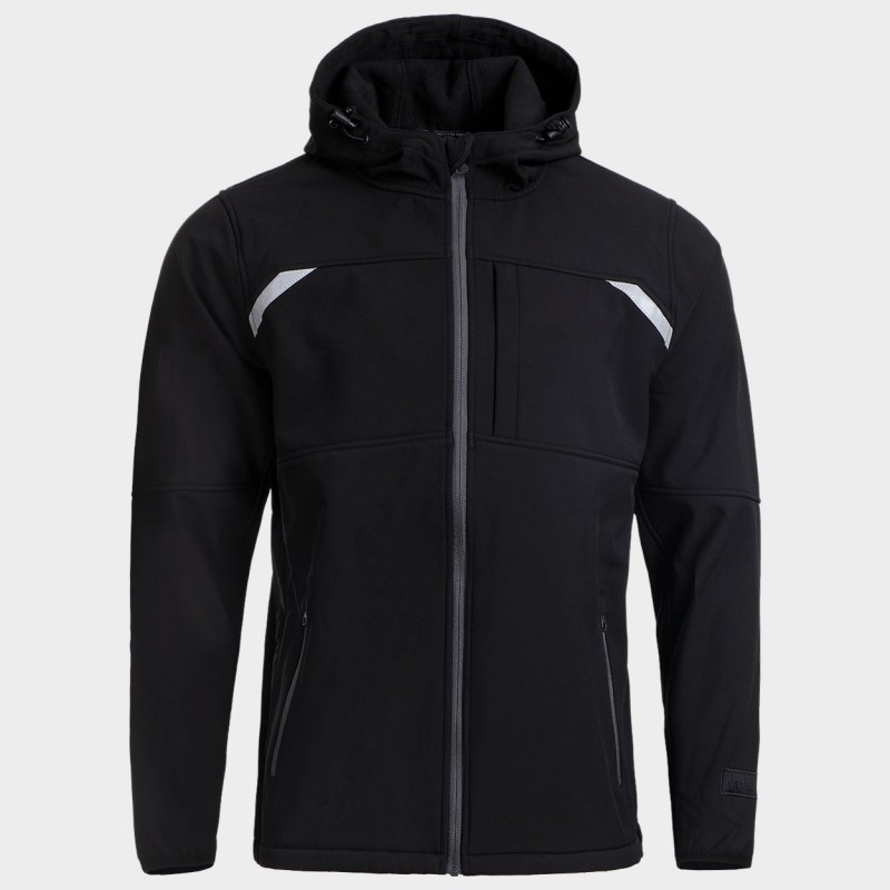 Μπουφάν softshell με κουκούλα, σχεδιασμένο για άνεση και προστασία κατά την εργασία σε εξωτερικούς χώρους υπό μεταβαλλόμενες καιρικές συνθήκες, με μαλακή φόδρα από φλις στο εσωτερικό.