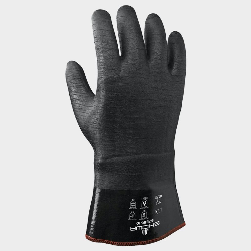 Γάντια με βαμβακερή βάση και μαύρη επίστρωση νεοπρενίου, κατάλληλα για εργασία σε σκληρές συνθήκες. Προστατεύουν από οξέα, διάφορες διαβρωτικές ουσίες, λάδια, γράσα και διάφορους διαλύτες.