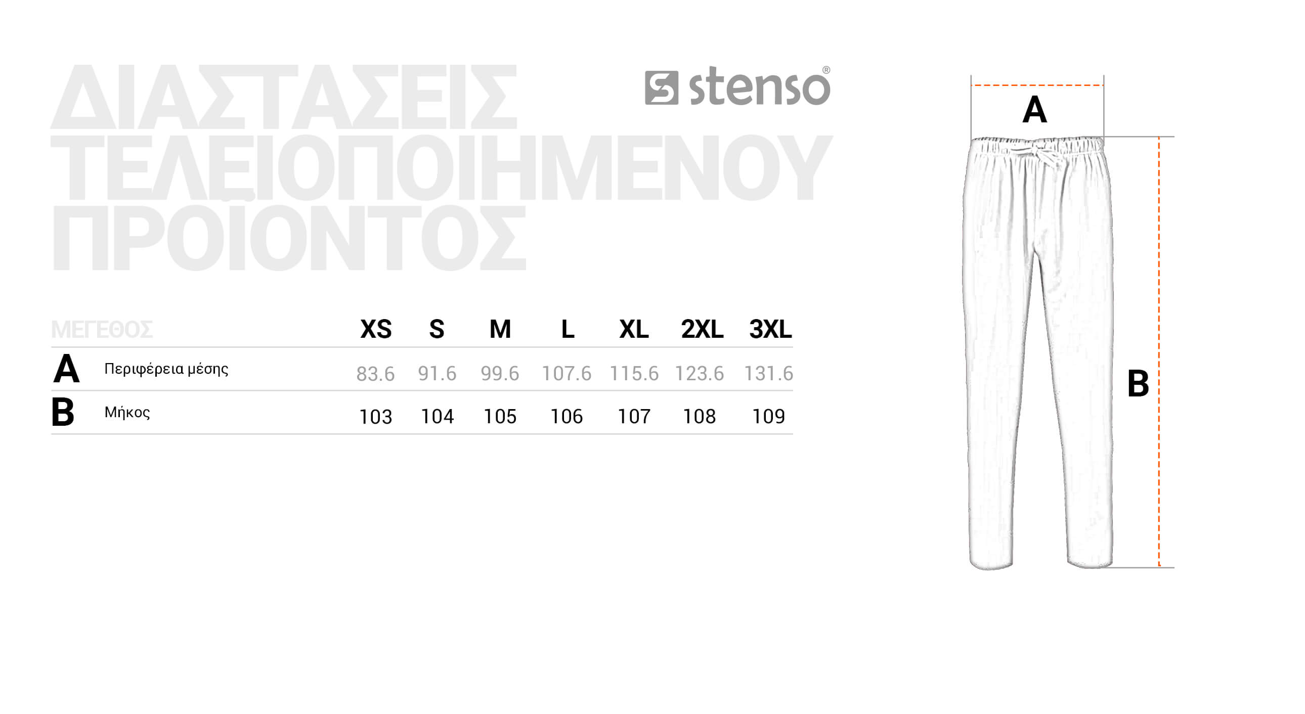 Παντελόνι, ελαστική μέση με κορδόνια, δύο μπροστινές και μία πίσω τσέπη. Αδιάβροχο, ανθεκτικό στους λεκέδες, αντιβακτηριδιακό, αναπνεύσιμο ύφασμα. Ελεύθερη κοπή.